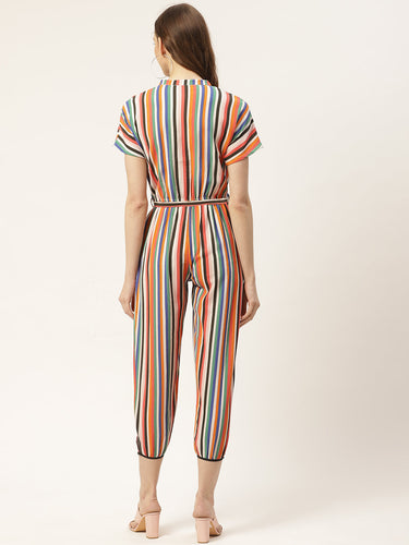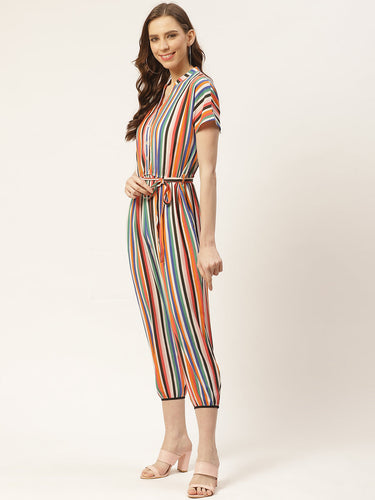 Striped full sleeves jumpsuit with pockets and a waistbelt
