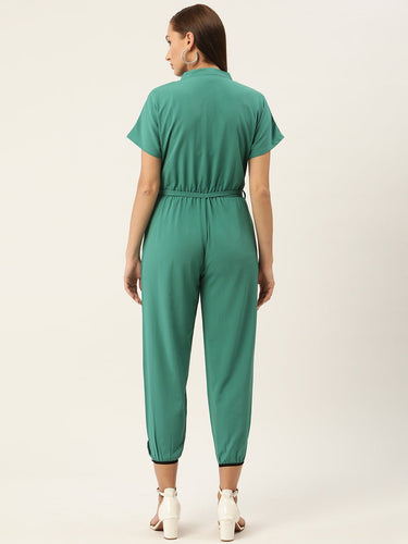Teal Blue solid basic jumpsuit ,has a v-neck, short sleeves, 2 pockets