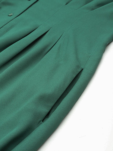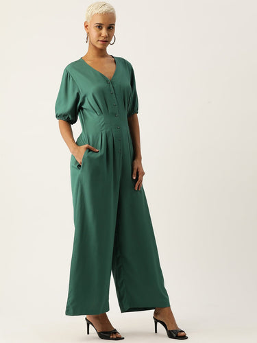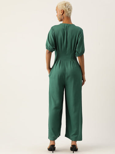 Dark Green solid basic jumpsuit, has a shoulder straps, sleeveless