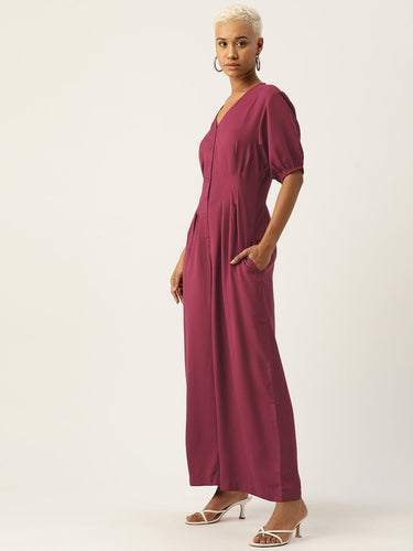 Lavender solid basic jumpsuit ,has a v-neck, short sleeves, 2 pockets
