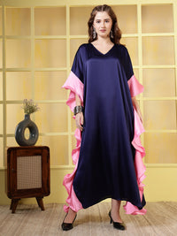 Navy Blue Satin Kaftan with Pink Ruffle Border